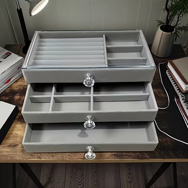 The box features a three-drawer system, providing ample space for storing various jewellery items.